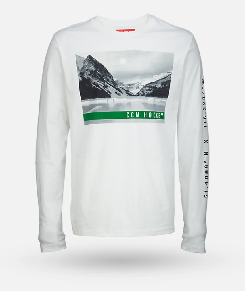 Black and white photo print of the best pond hockey in the world, the Lake Louise. Coordinates printed on sleeve.